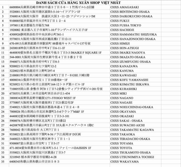 DANH SÁCH CỬA HÀNG XUÂN SHOP VIỆT NHẬT